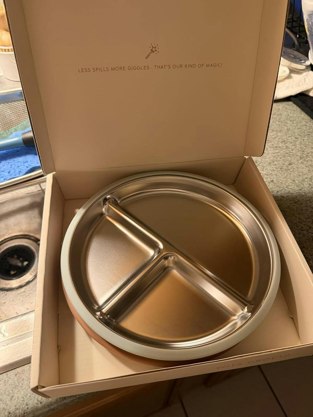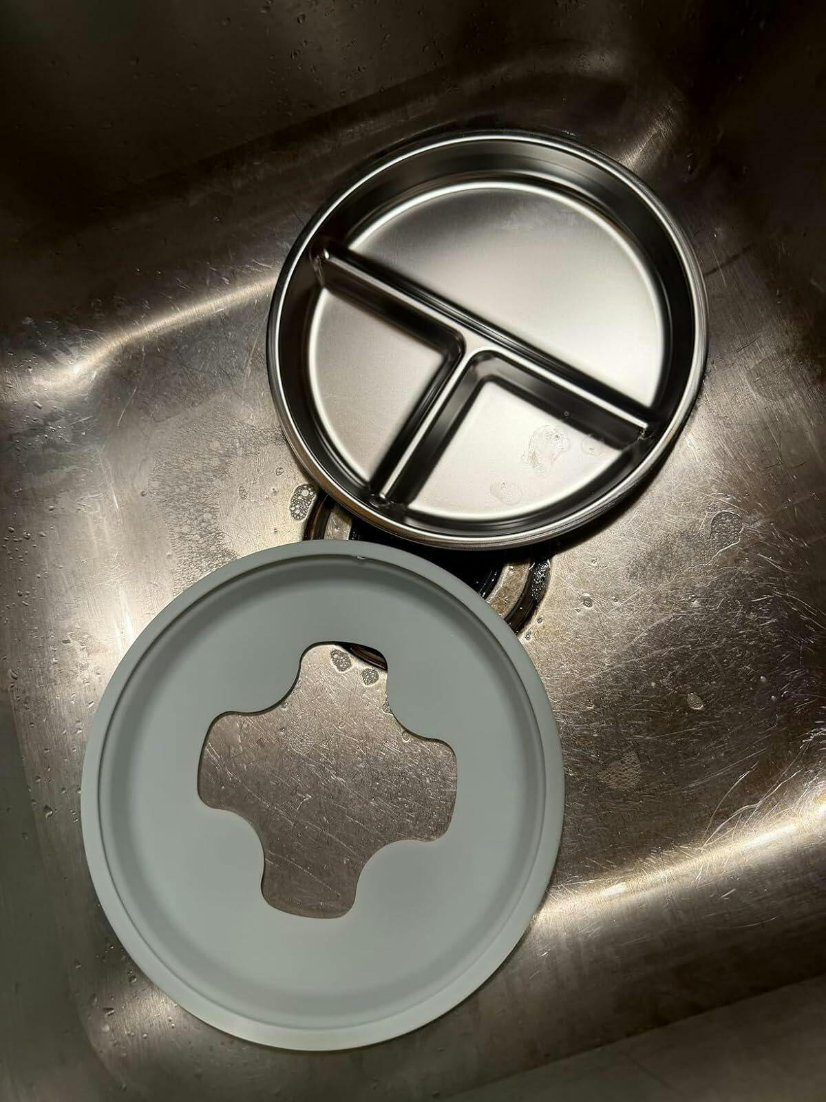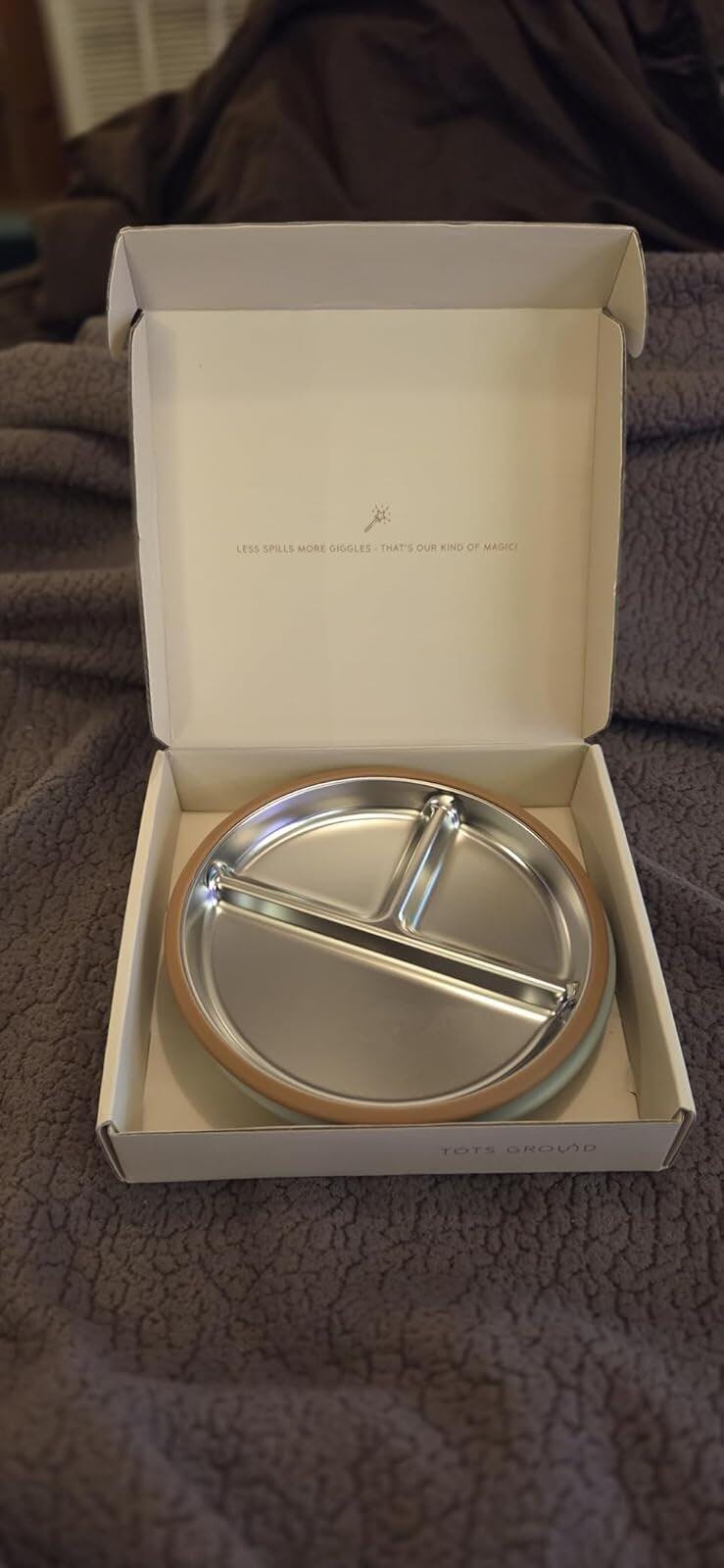 I love these plates for my toddler. They are perfect because the suction sticks really well on the table or high chair, but it also comes off when cleaning or when he doesn’t need it anymore. The stainless steel plate is pretty thick and cleans really well. This is the perfect set for any toddler with the three compartments and nice color.