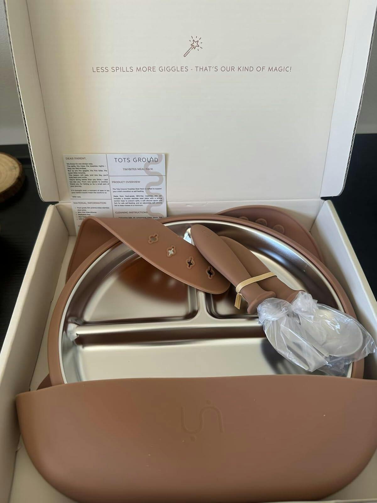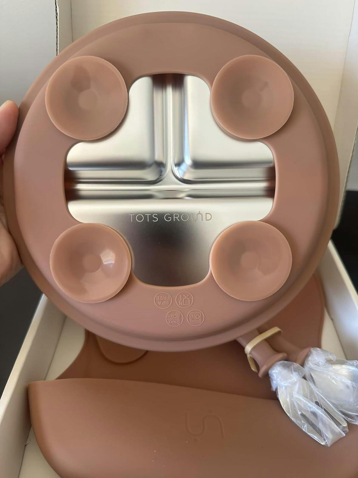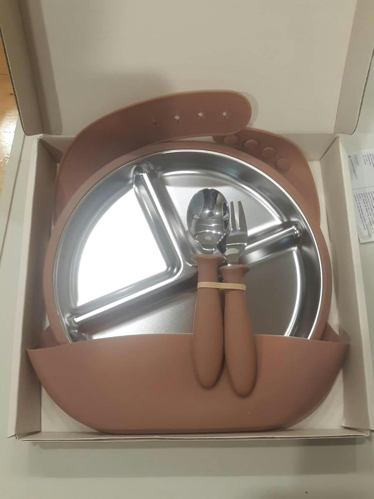 I love this stainless steel 4 piece feeding set. I ordered the mocha mousse set and I am obsessed with the color. It is gender neutral and so pretty. The set comes with a suction plate, silicone bib, spoon and fork. The plate has a removable shell and dividers on the plate itself. All items are BPA free and non toxic. The suction is so strong, I was surprised. No mess when using the suction base and easy to use. The plate and silverware are very easy to clean. The set is freezer safe, dishwasher safe but can not go in the microwave. The bib has an adjustable neck, wide catch area and is so soft.