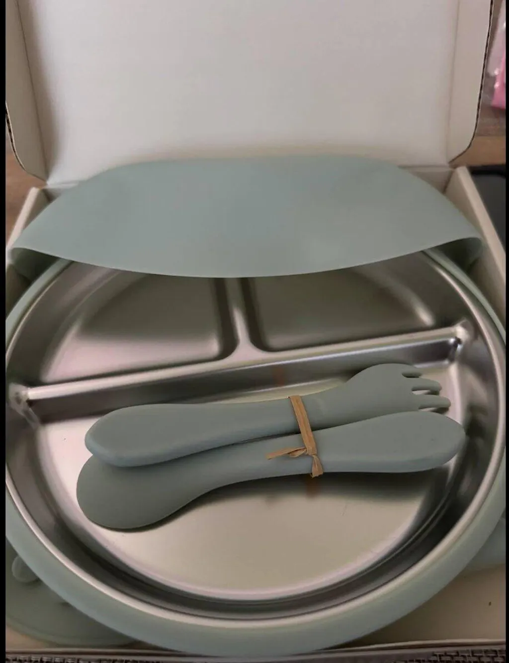 I recently got this stainless steel plate with suction base, paired with a silicone bib and utensils (spoon and fork), and I'm excited to introduce it to my little one in a few months.