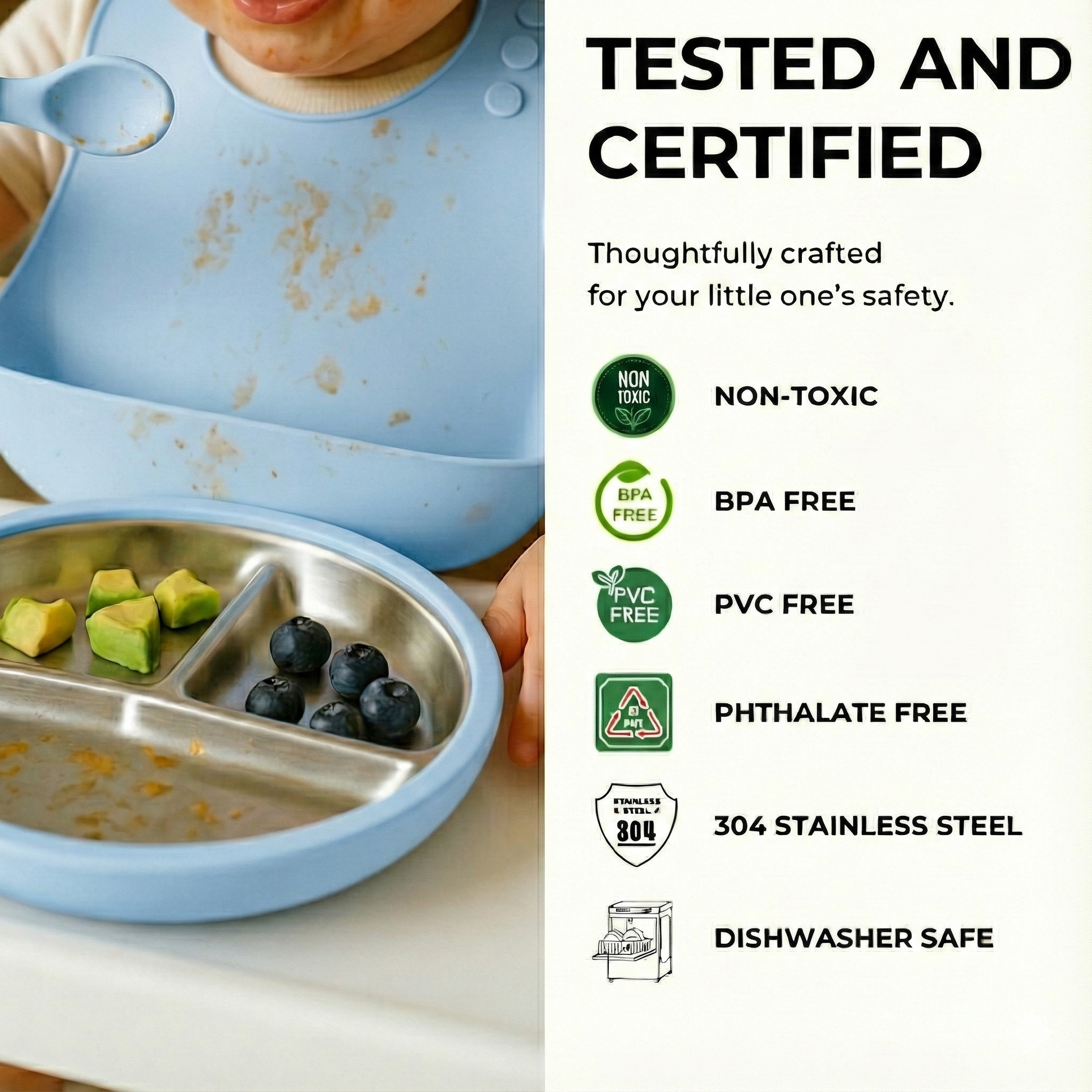 - Dishwasher-Safe: All components (plate, spoon, fork, and bib) are safe for the top rack of a dishwasher.